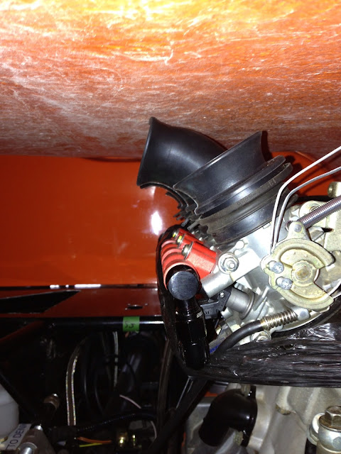 Fitted a pair of 90' angled ends on the throttle bodies and connected the ends of the cables. Had a real difficult time finding 90' adaptor ends, managed to get some from a Lambretta specialist. Once fitted seemed to work pretty well. Just need to fit a stronger spring to the throttle body to get a more positive closure of the throttle butterflies.